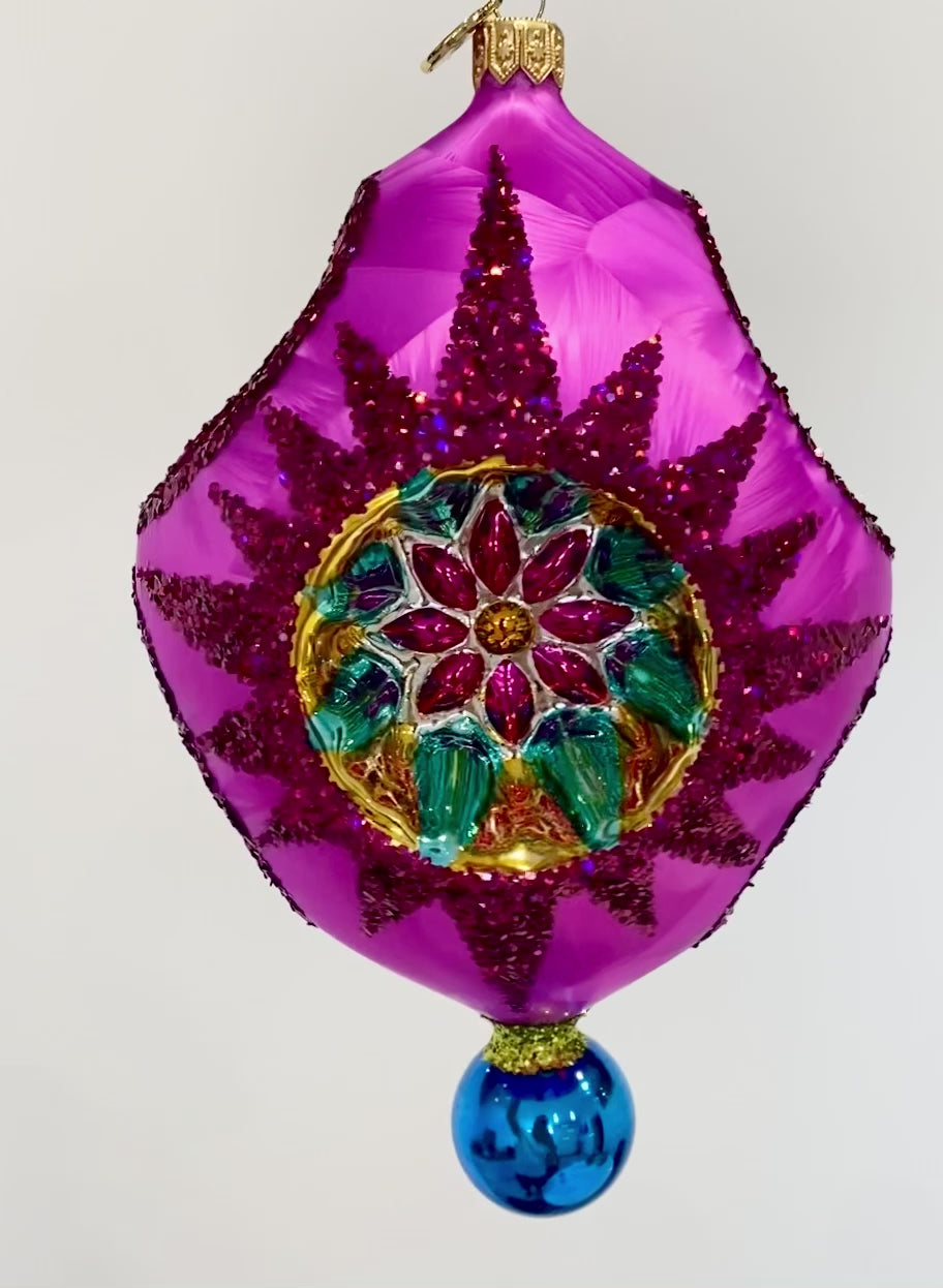 Prawdziwe dzieło rzemiosła, ta wyjątkowa szklana ozdoba zachwyca bogato zdobionymi, ręcznie tłoczonymi wcięciami w kwiatowe wzory, migoczącym brokatem oraz żywymi barwami. Jej promieniste magentowe ciało, kamieniowe akcenty i lśniąca niebieska kropla czynią z niej oszałamiającą ozdobę na każdej choince.