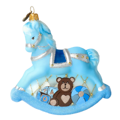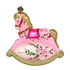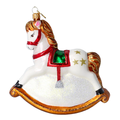 Urocza, ręcznie malowana bombka w kształcie białego konika na biegunach, ozdobiona złotymi elementami, czerwonym siodełkiem oraz świąteczną poinsecją na podstawie. Pełna klasycznego uroku, idealna do tradycyjnych, eleganckich dekoracji świątecznych
