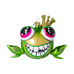 A colorful ornament shaped like a cheerful frog with big green eyes and a wide, toothy smile featuring a candy cane. Painted in festive red and green, it adds a playful charm to any Christmas tree.