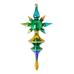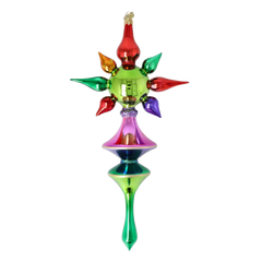 A vibrant red and gold star with contrasting jewel-toned spikes, evoking festive energy and handcrafted brilliance.
