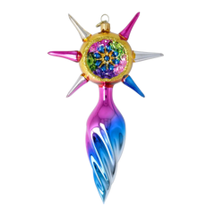 Crimson Solar. A bold hand-blown glass finial in deep red tones, centered with a radiant, jewel-like core. Designed to capture light and attention in refined interiors.
