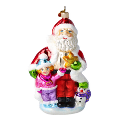 This charming ornament captures a heartwarming winter scene with a blue-robed Santa, a cheerful child holding a golden star, and a smiling snowman companion. Dressed in frosty blues and shimmering whites, this handcrafted glass figure embodies the joy, wonder, and togetherness of the holiday season. A delightful addition to any festive décor.