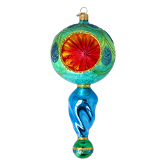 Elegant, hand-painted retro-style glass ornament with a stunning reflective indentation that beautifully catches the light. Decorated with green and gold accents and delicate glitter details, it adds a touch of vintage charm to any Christmas tree. It is a perfect holiday decoration for a warm and festive atmosphere. Due to its handmade nature, each decoration may differ slightly from the others, adding to its charm and emphasizing its uniqueness. Colors may vary slightly depending on photos and settings of different displays.