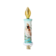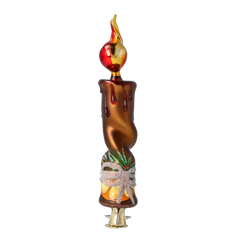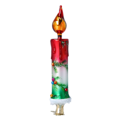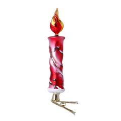 A festive glass candle ornament adorned with a vibrant poinsettia flower, golden accents, and a glowing red-and-gold flame. Its elegant twisted shape and snowy base bring warmth and Christmas charm to any tree.