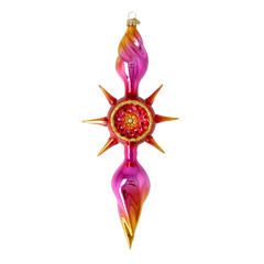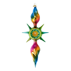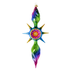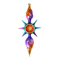 A vibrant star ornament blending fiery reds, golden yellows, and cool blues into a luminous, swirling glass form inspired by solar energy.