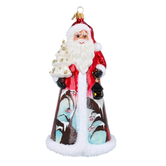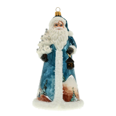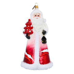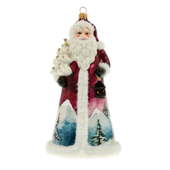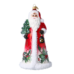 Celebrate the warmth of fall with this vibrant glass ornament featuring Santa in a glittering orange coat. He holds a pearl-trimmed white Christmas tree and a lantern, while his robe is beautifully adorned with hand-painted sunflowers, grapes, and autumn leaves. The back showcases a festive Thanksgiving scene with a cheerful turkey surrounded by a bountiful harvest. A unique blend of holiday cheer and harvest celebration—perfect for seasonal decorating.