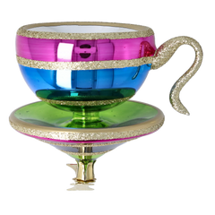 Eloria Cup to błyszcząca, wielobarwna szklana ozdoba inspirowana klasycznym kształtem filiżanki, z żywymi pasami różu, złota, niebieskiego i zieleni. Figlarna, a zarazem elegancka dekoracja, która dodaje uroku i barw świątecznemu wystrojowi.