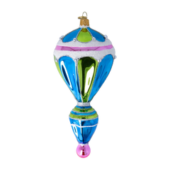 Wspaniała szklana ozdoba inspirowana ponadczasowym urokiem balonu na gorące powietrze. Ta ręcznie dmuchana i starannie ręcznie malowana dekoracja łączy harmonijnie świąteczne barwy — głęboką czerwień, szmaragdową zieleń oraz nieskazitelną biel — podkreślone migoczącymi złotymi detalami. Górna część zdobiona jest delikatnym matowym wykończeniem, przypominającym ośnieżone szczyty, natomiast dół prezentuje ozdobną złotą podstawę z promienistą, perłową kulą.