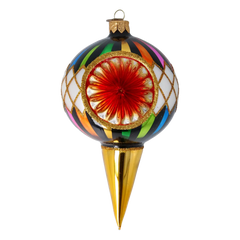 Luksusowa, ręcznie malowana szklana ozdoba, prezentująca olśniewający kalejdoskop bogatych, szlachetnych barw, oprawionych w złociste ażurowe zdobienia. Olśniewający czerwony reflektor w centrum pięknie łapie i odbija światło, dodając ciepłego, świątecznego blasku. Uzupełniona eleganckimi złotymi akcentami i smukłą, zakończoną szpicem zawieszką, ta ozdoba emanuje starodawnym urokiem i królewską wytwornością, czyniąc ją znakomitym dodatkiem do każdej choinki. Unikalny charakter: Dzięki technice ręcznego malowania i zdobienia każda ozdoba różni się subtelnymi detalami, co czyni ją niepowtarzalną. Prosimy pamiętać, że kolory mogą nieznacznie różnić się w zależności od zdjęć i ustawień wyświetlacza.